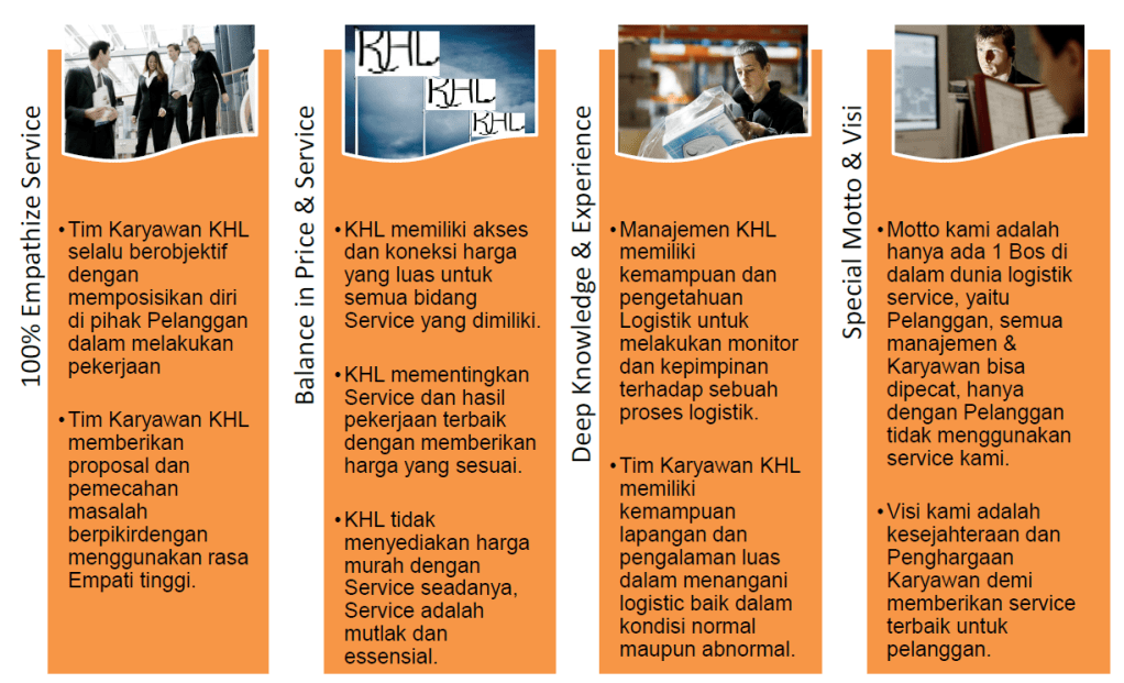 - Kepuasan konsumen adalah mutlak dan esensial. Dengan pengalaman dan pengetahuan dalam menangani proses logistik normal maupun abnormal, KHL membantu monitoring dan penyelesaian proses lapangan. Pelayanan terbaik untuk konsumen dan penghargaan kesejahteraan karyawan.